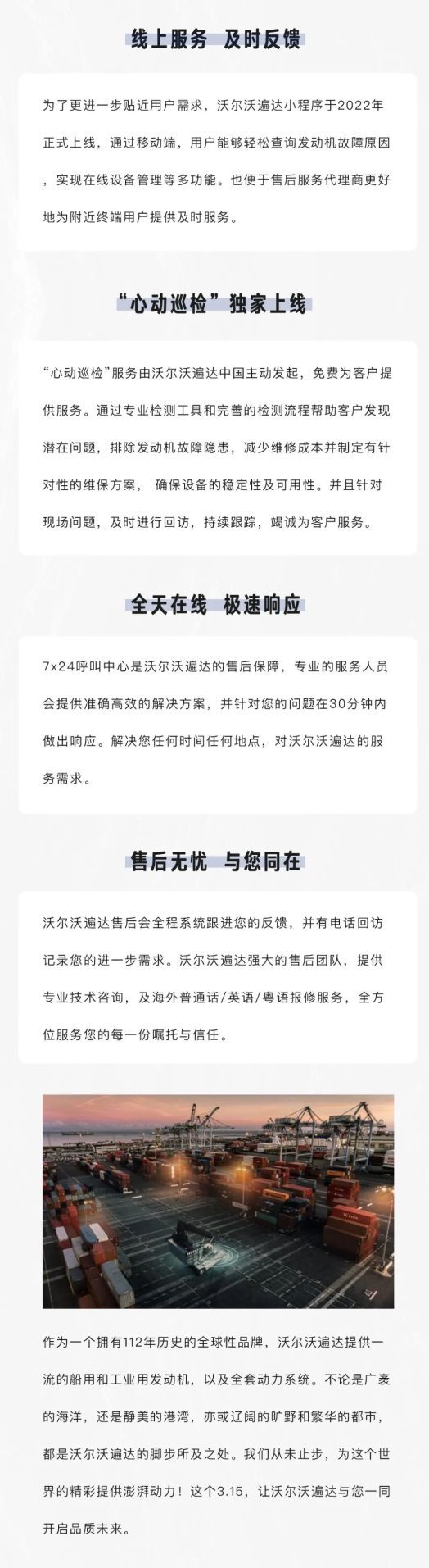 沃爾沃遍達7×24小時的服務(wù),用完整的售后服務(wù)體系,為客戶提供確保安裝、操作和維護的一站式服務(wù)。
